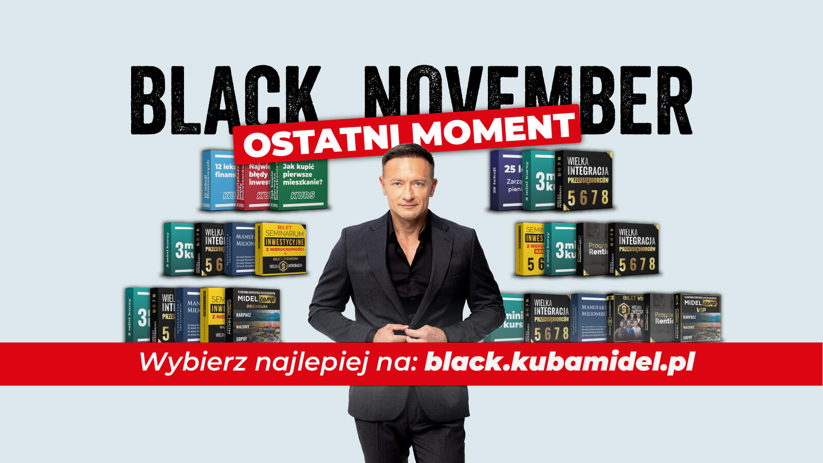 Największa akcja edukacyjna i inwestycyjna roku!Listopad wcale nie musi być ponury — wręcz przeciwnie. W tym miesiącu przygotowaliśmy coś wyjątkowego dla wszystkich, którzy chcą zainwestować w siebie, swoją wiedzę i finansową niezależność.Black November to specjalna akcja, w której przez cały miesiąc możesz zdobyć dostęp do najlepszych kursów, wydarzeń i mentoringów Kuby Midela — w wyjątkowo obniżonych cenach, nawet do –80% taniej.W ofercie znajdziesz 6 unikalnych pakietów:📘 Paczki online – praktyczna wiedza, konkretne lekcje, strategie inwestycyjne i finansowe zebrane z lat doświadczeń.🎟️ Paczki eventowe – bilety na najważniejsze wydarzenia roku: Seminarium Inwestycyjne, Wielką Integrację oraz wyjątkowe obozy szkoleniowe MIDEL CAMP.💎 Pakiety VIP – limitowane miejsca dla osób, które chcą pracować bezpośrednio z Kubą Midlem – mentoring, konsultacje indywidualne i dostęp do zamkniętej społeczności inwestorów.Każda paczka to inwestycja w rozwój osobisty, relacje i praktyczną wiedzę, która pozwala szybciej budować niezależność finansową.📆 Promocja trwa przez cały listopad, ale warto się spieszyć — co tydzień ceny rosną, a liczba miejsc na wydarzenia stacjonarne jest ograniczona.💼 Po zakupie otrzymasz fakturę VAT, dzięki czemu możesz wliczyć wydatek w koszty działalności i jeszcze bardziej zoptymalizować inwestycję w swój rozwój.Nie czekaj do ostatniego dnia.
